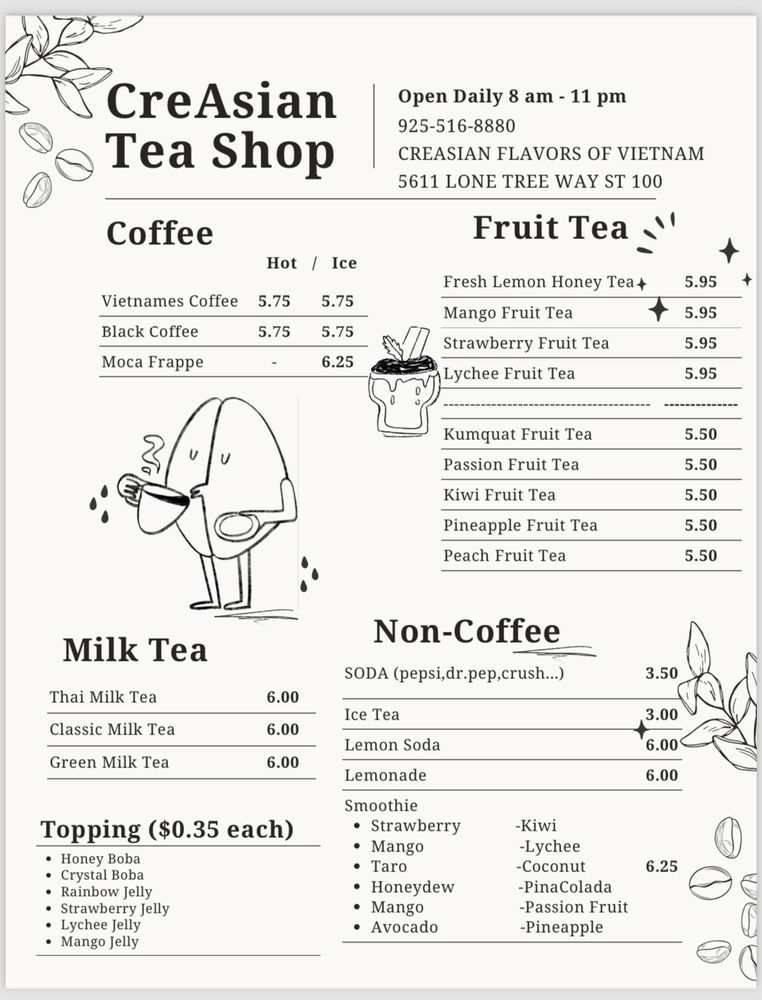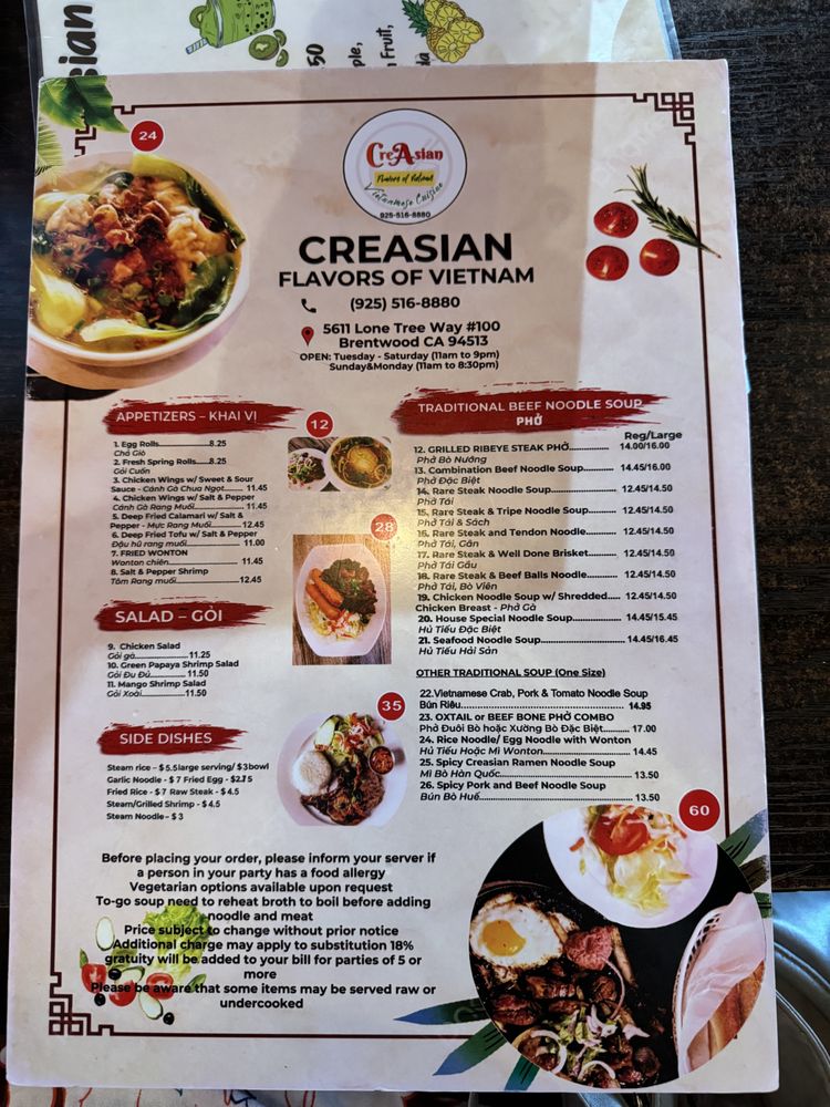 Cre Asian Flavors of Vietnam in Brentwood, CA offers a wide range of Vietnamese dishes with vegan and vegetarian options. The restaurant provides excellent customer service for dine-in and to-go orders, with dishes like pho, rice noodles, garlic noodles, and house special pho receiving high praise. The ambiance inside the restaurant is inviting, with plenty of seating and a beautiful interior decor. The menu features side dishes, salads, and appetizers like chicken wings and egg rolls. Customers commend the flavorful broth, delicious tofu, and generous portion sizes. The staff is attentive and accommodating, making the dining experience enjoyable. Overall, Cre Asian Flavors of Vietnam is a hidden gem in the area, offering tasty and affordable Vietnamese cuisine in a welcoming environment.